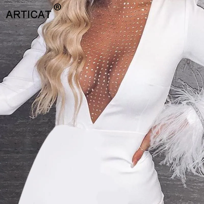 HIGH QUALITY Articat Sexy Deep V Neck Mesh Bodycon Dress Women Long Sleeve Bodycon Sequin Christmas Dress Fashio
